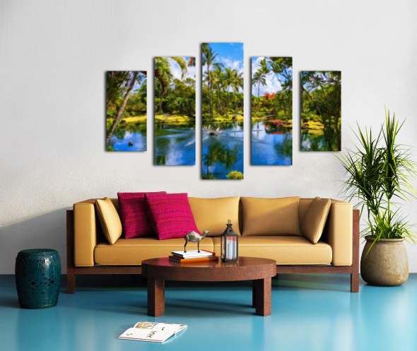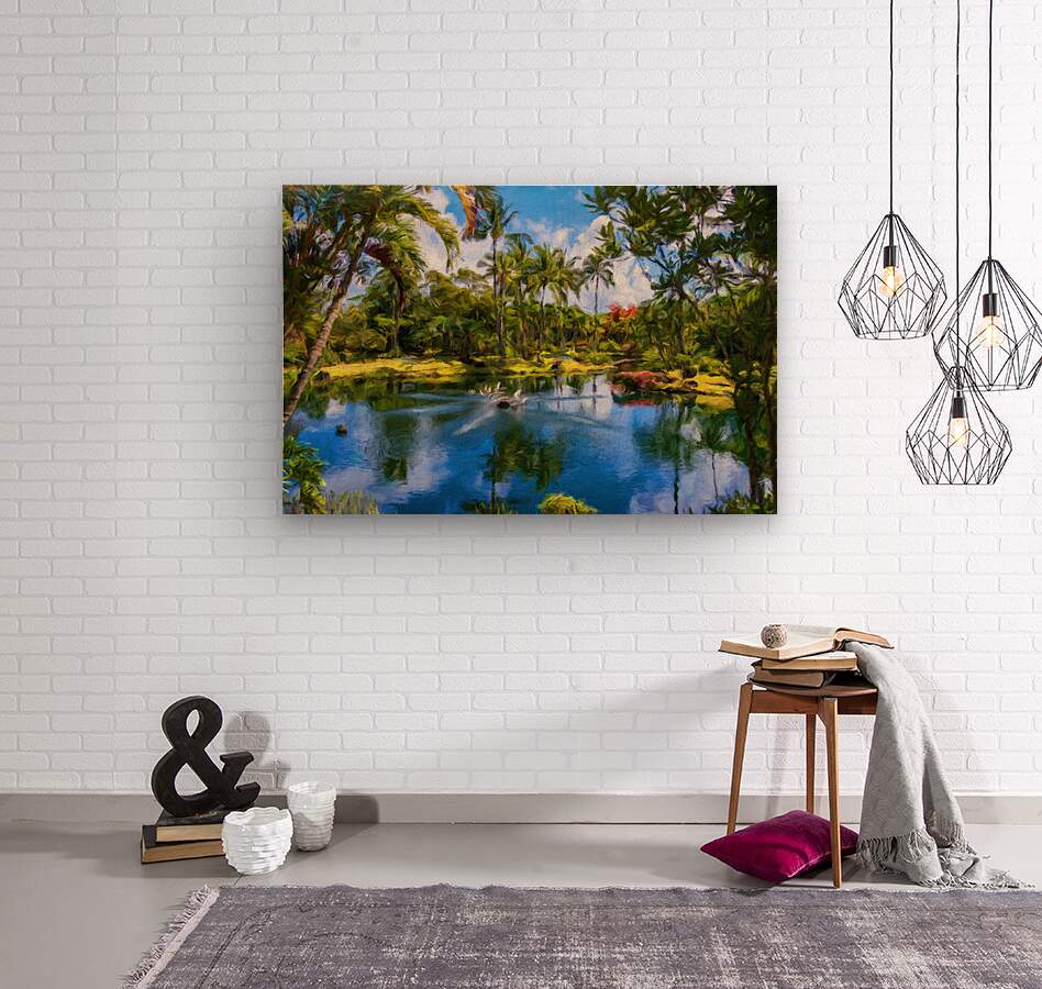 Digital impressionistic oil painting of Ka Ula Lagoon in the Na Aina Kai sculpture gardens near Kilauea on north coast of Hawaiian island of Kauai on beautiful warm summer day. Perfect to remember a lovely vacation in Hawaii