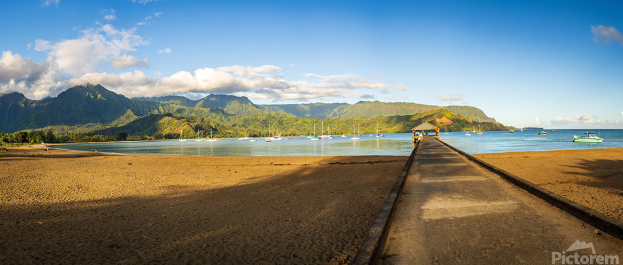 Get this artwork "Panorama of the sandy beach and Hanalei Pier at sunrise" in a framed print.