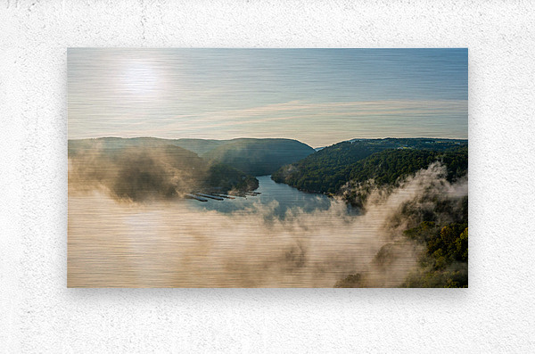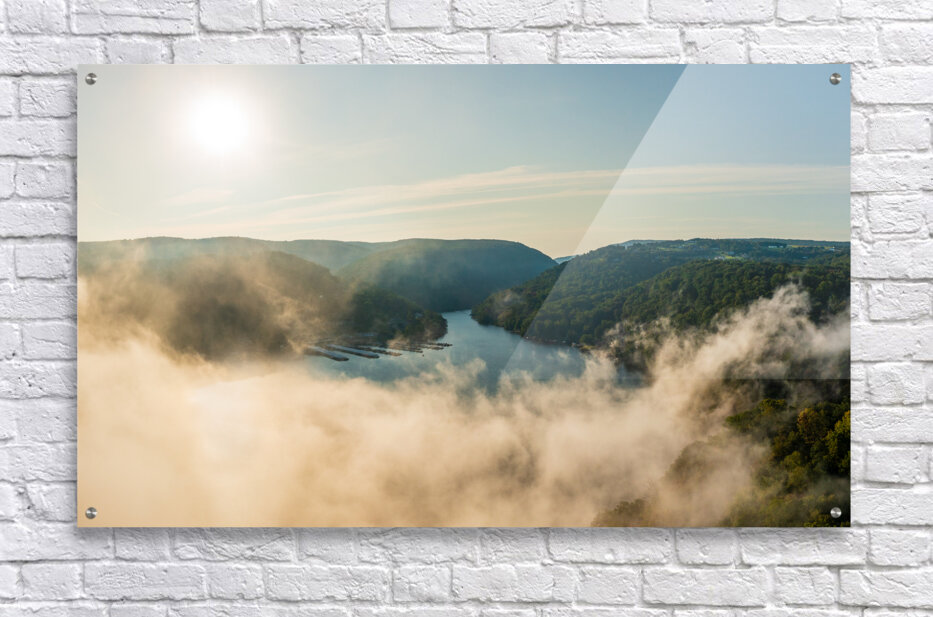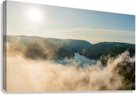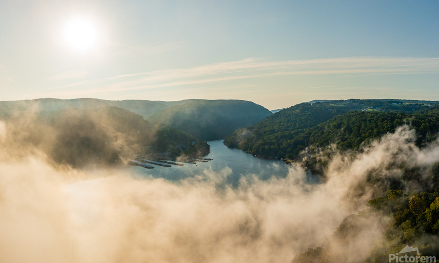 Unusual mist and fog forming over Cheat Lake with aerial view across the lake to marinas and to the Cheat River entering the scene