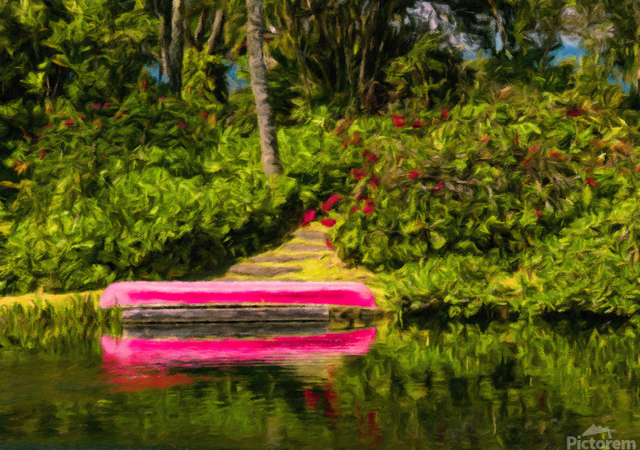 Digital oil painting in impressionistic style of a red canoe stored on dockside and reflecting the calm waters of a pond or lake. The water is surrounded by a beautiful garden