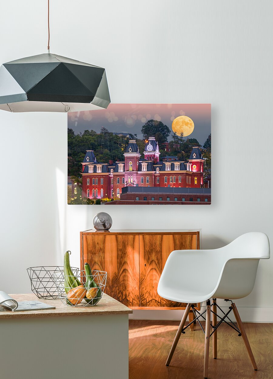 ABOUT THIS ARTWORK: MOONRISE OVER ILLUMINATED WOODBURN HALL AT WVU MORGANTOWN