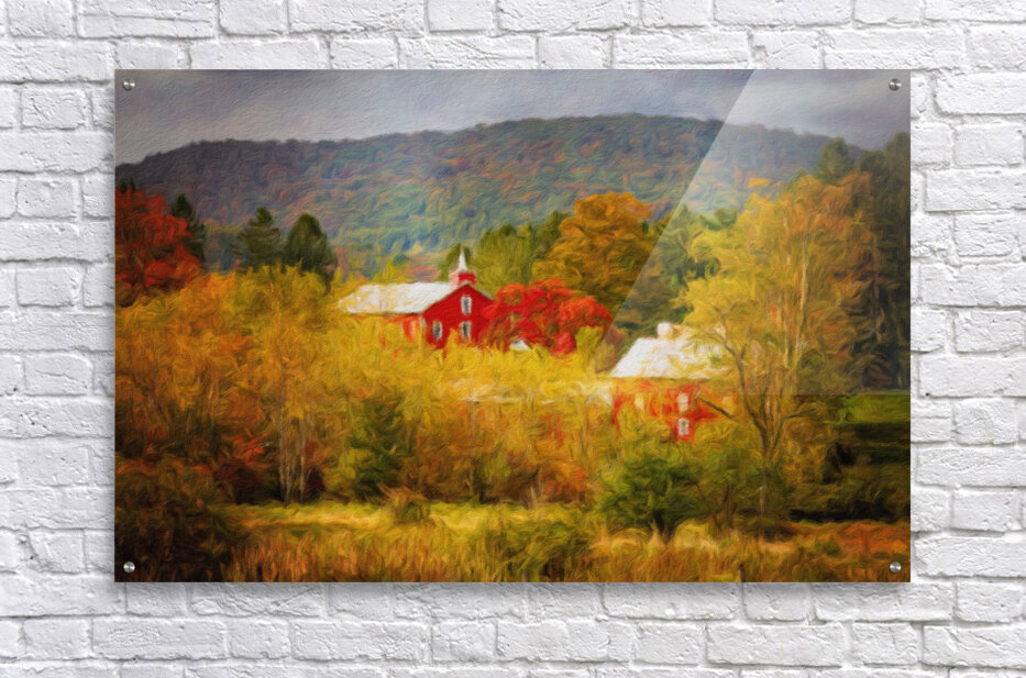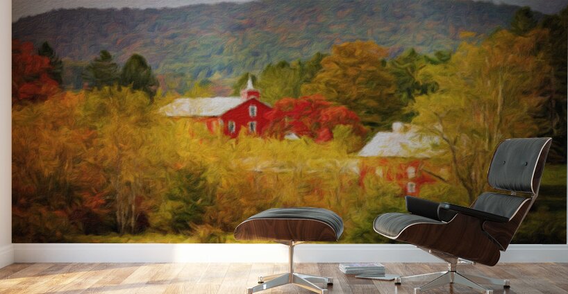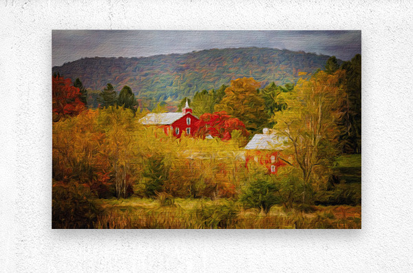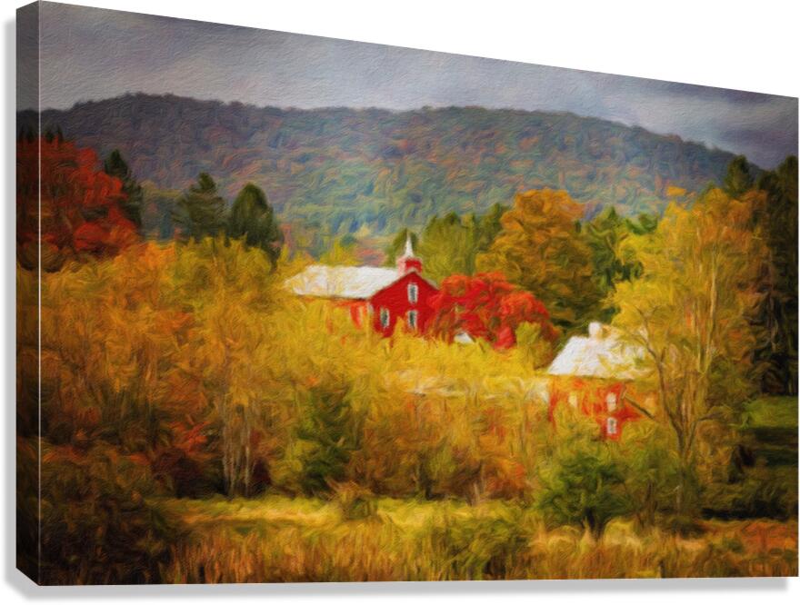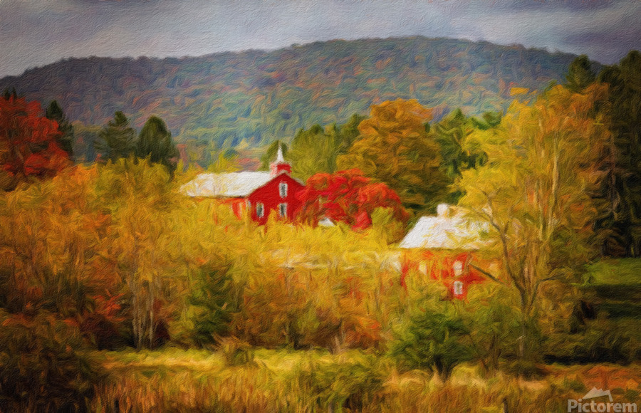 Digital impressionistic oil painting of a historic red barn and farm buildings nestled in the trees in autumn near Aurora in West Virginia in the fall