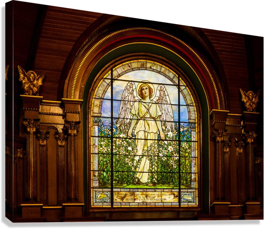 Antique priceless Louis Tiffany stained glass windows in the St Luke Methodist church in Dubuque Iowa. Installed from 1896 they were among the first to have colour placed in the glass rather than painted on the surface. This window is the Angel among the Lilies and is a Resurrection picture given in memory of an 18 year old daughter. The lilies mean new life and white is for purity.