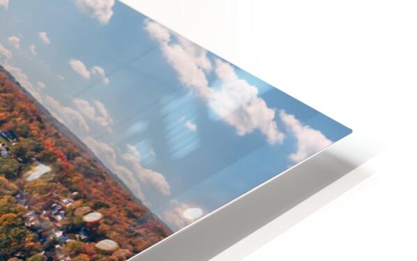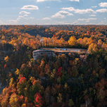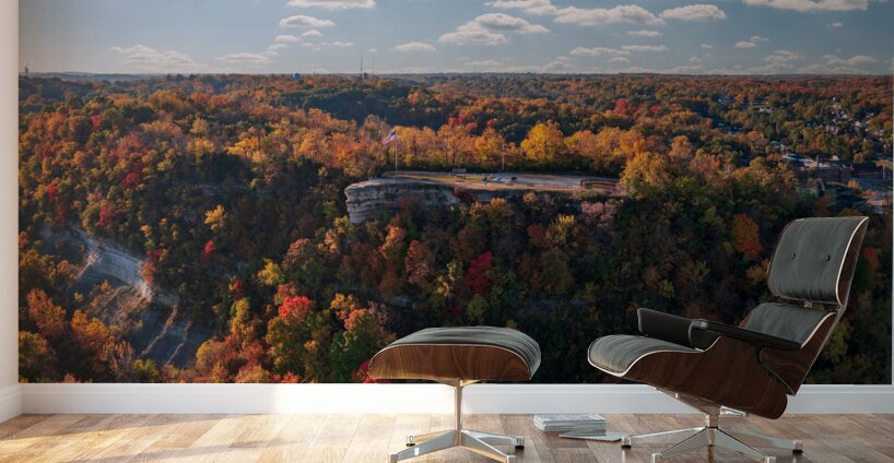 Aerial view of the Lovers Leap overlook in Hannibal Missouri with brilliant fall colors on the trees around the town