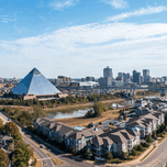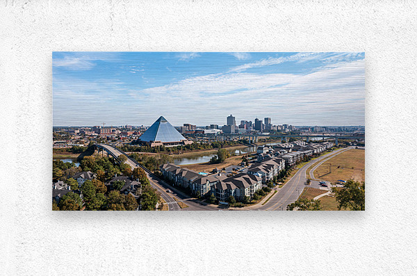 Panoramic view of Memphis Tennessee cityscape with low water levels in the Mississippi river