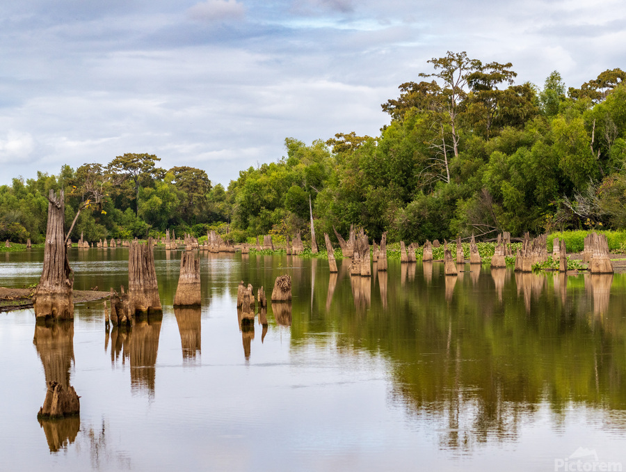 ABOUT THIS ARTWORK: STUMPS OF BALD CYPRESS TREES RISE OUT OF WATER IN ATCHAFALAYA BA