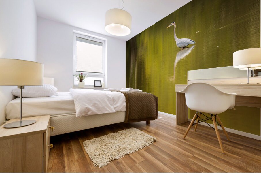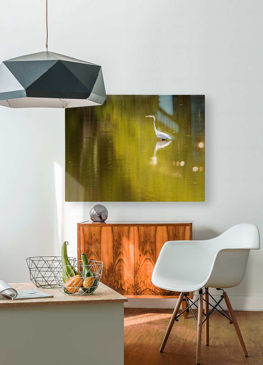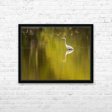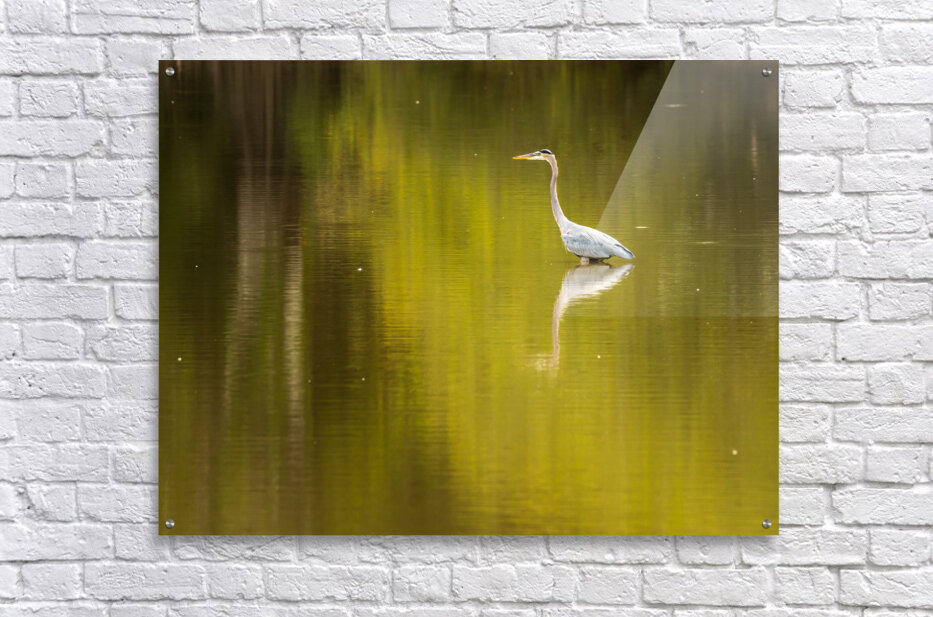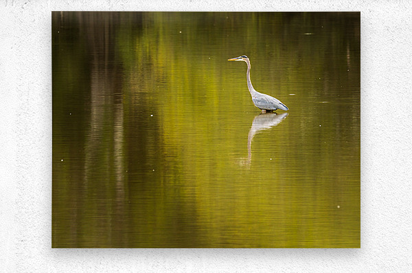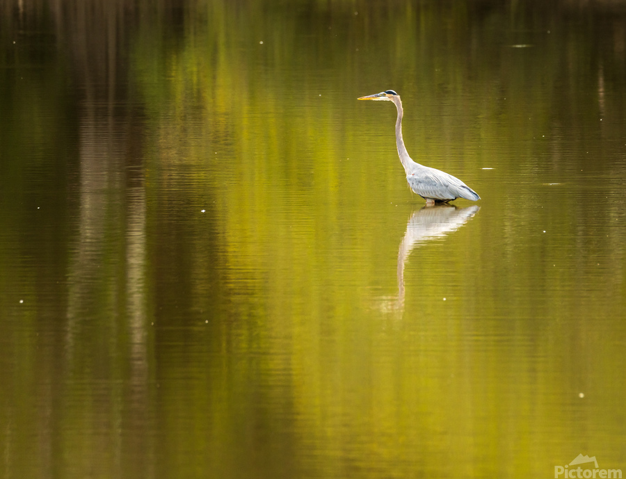 ABOUT THIS ARTWORK: GREAT BLUE HERON STANDING IN CALM WATER IN ATCHAFALAYA BASIN