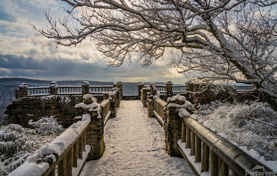 ABOUT THIS ARTWORK: COOPERS ROCK OVERLOOK ON SNOW-COVERED PATHWAY IN WV