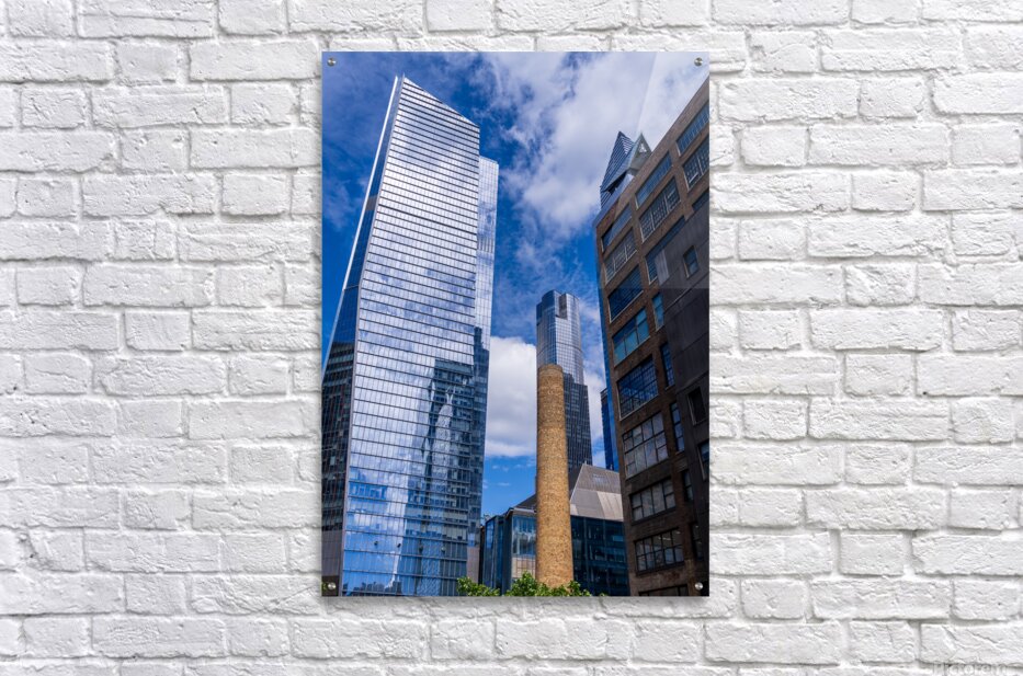 SUR CETTE OEUVRE: LOOKING UP AT MODERN BUILDINGS BY BRICK CHIMNEY IN HUDSON YARDS