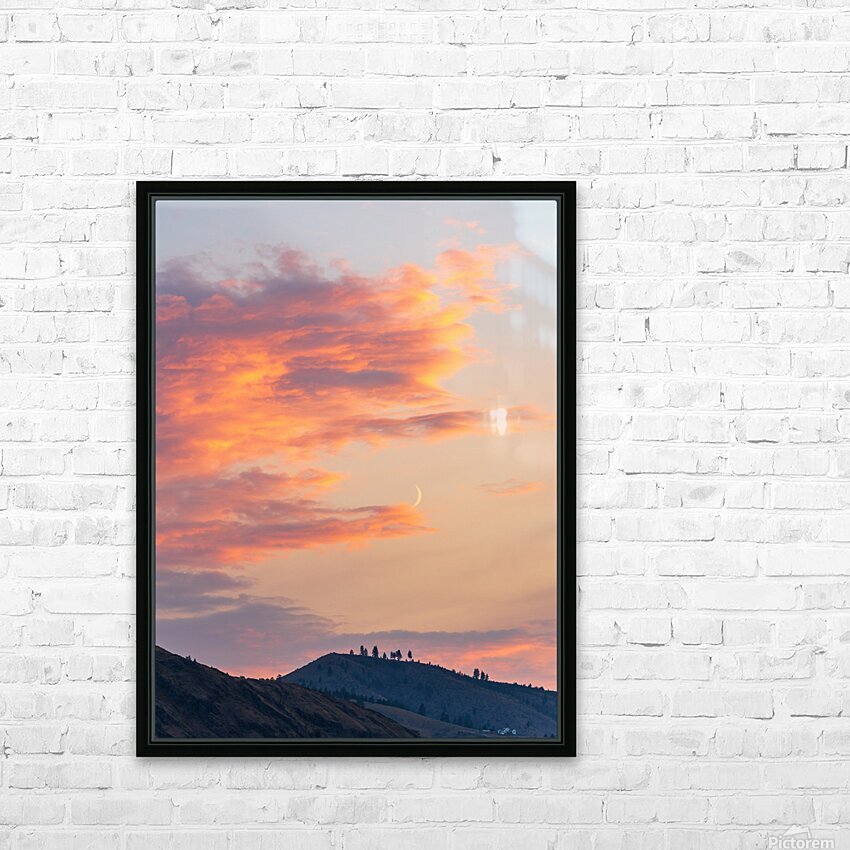 Pour obtenir "Fiery sunset clouds enveloping the new crescent moon over Lake C" dans une impression encadrée.