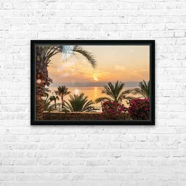 Flowers and palm tree frame the sunset over the Dead Sea in Jordan with Israel in the distance