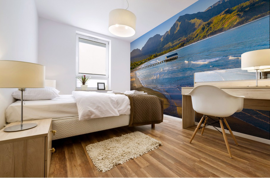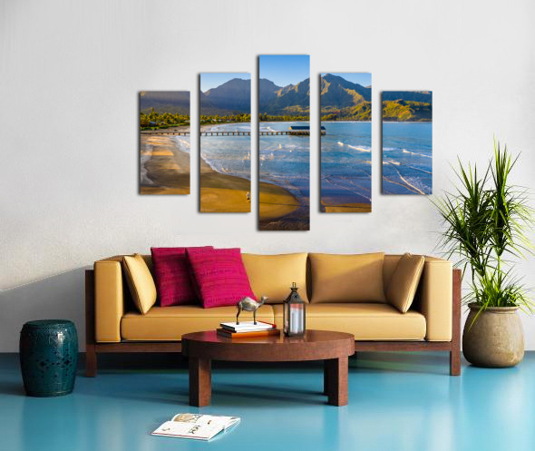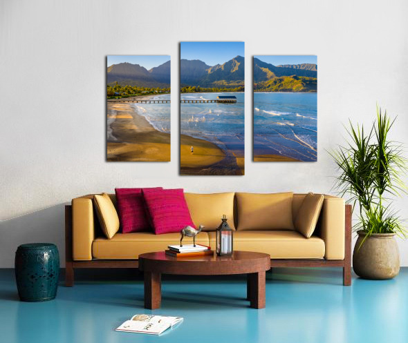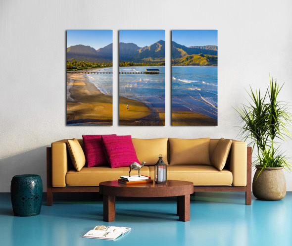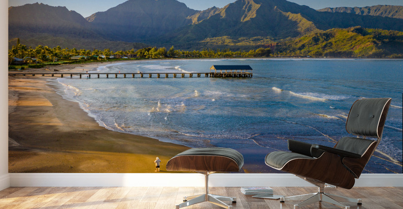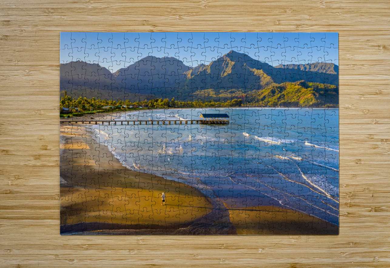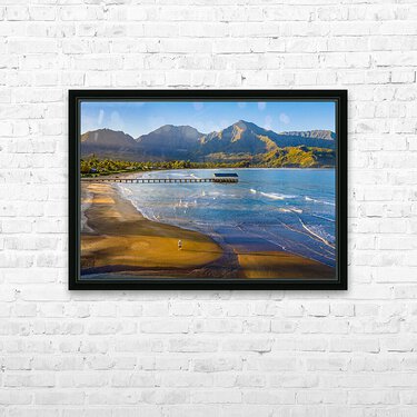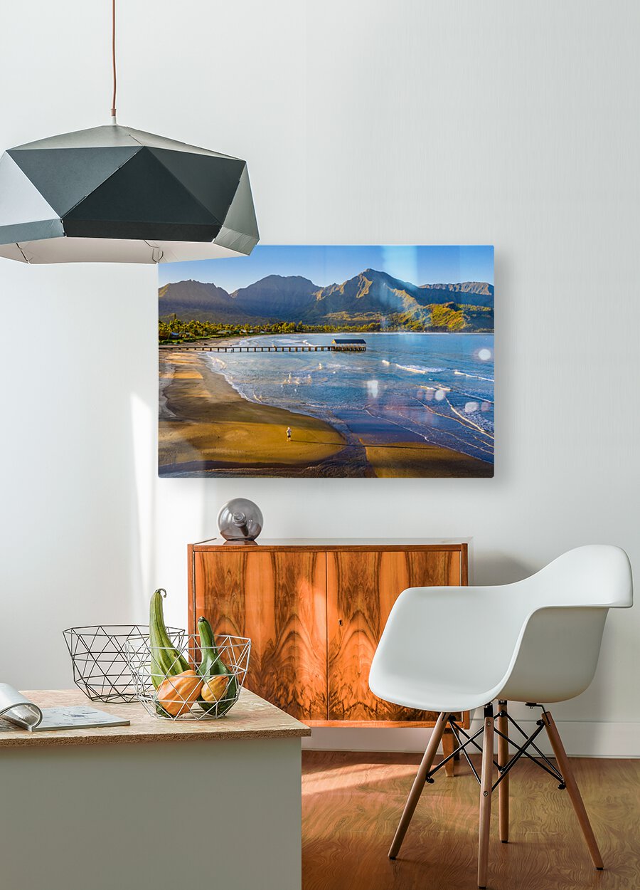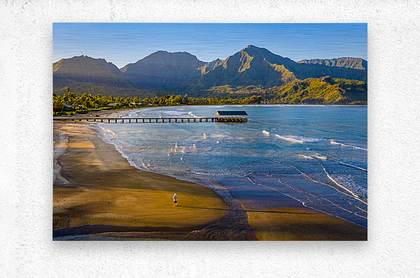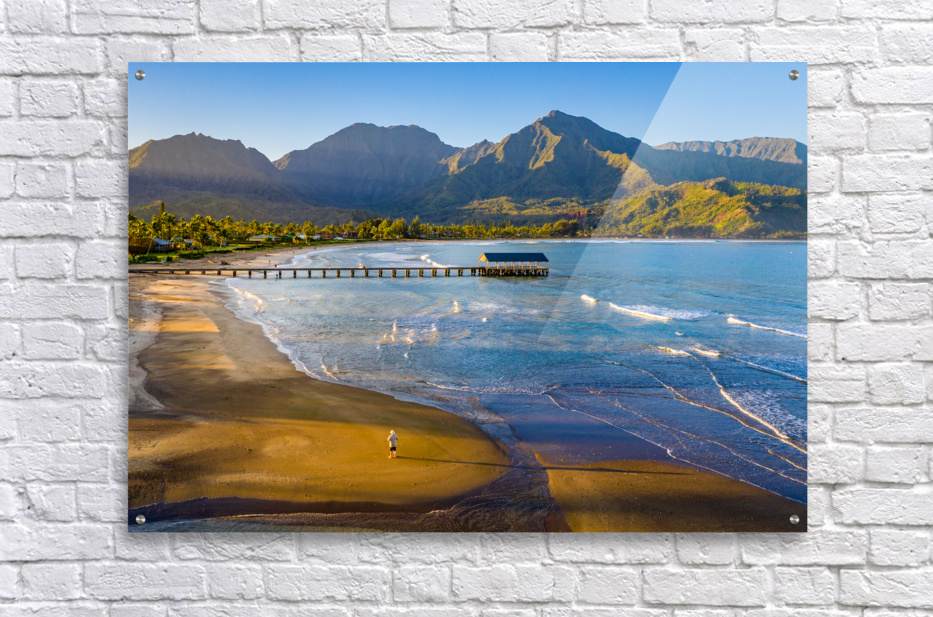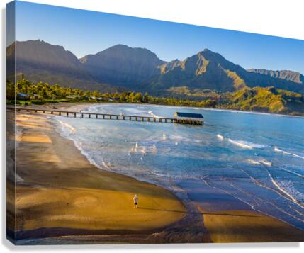 Immerse yourself in the breathtaking beauty of Hanalei Bay on the enchanting Hawaiian island of Kauai with this awe-inspiring aerial image at sunrise. As the first rays of golden light paint the sky, witness the serenity of a lone figure standing on the pristine beach, embraced by nature's splendor. This evocative photograph captures the essence of tranquility, inviting you to escape the ordinary and embrace the extraordinary. Grace your living space with the allure of Hanalei Bay's panoramic vista, and let the magic of the moment transport you to a place of peace and wonder.