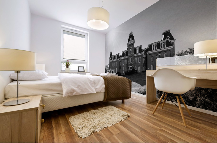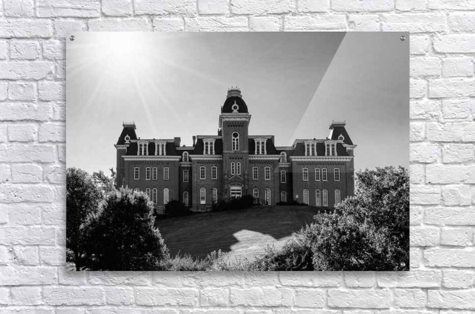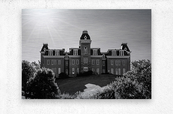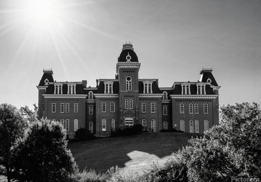 Old fashioned black and white image of Woodburn Hall at West Virginia University or WVU in Morgantown. Would make an ideal gift for a recent graduate of the college