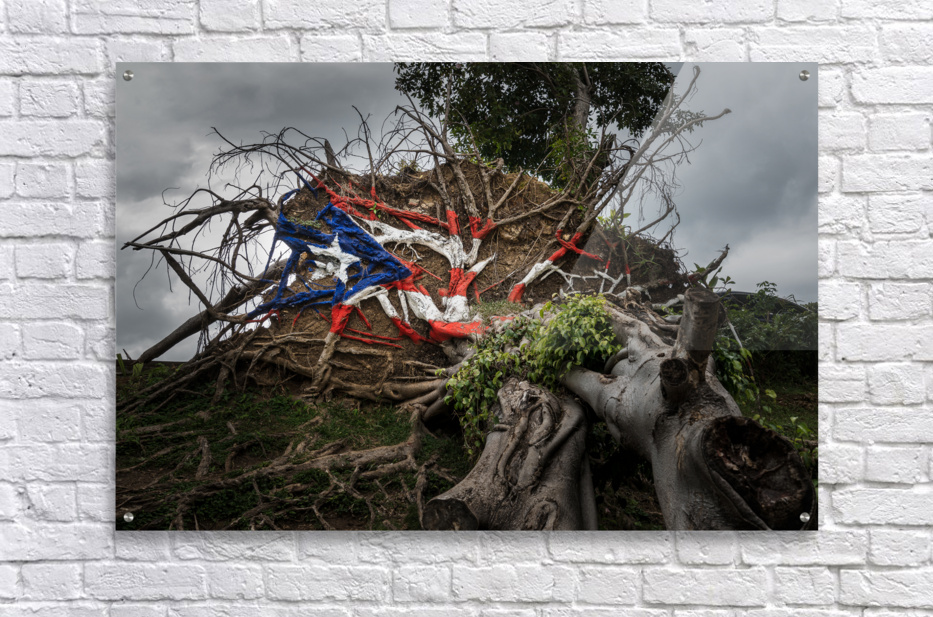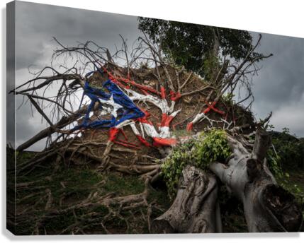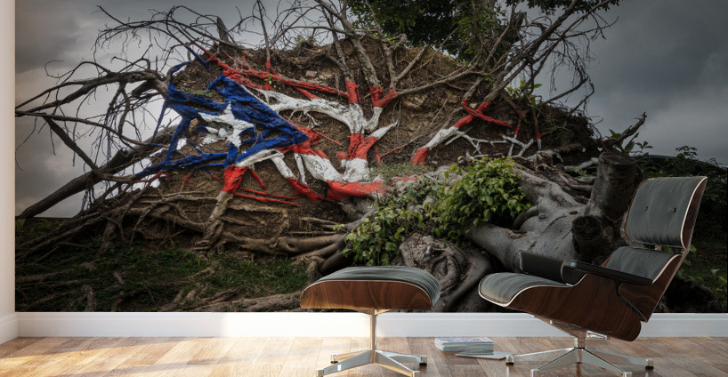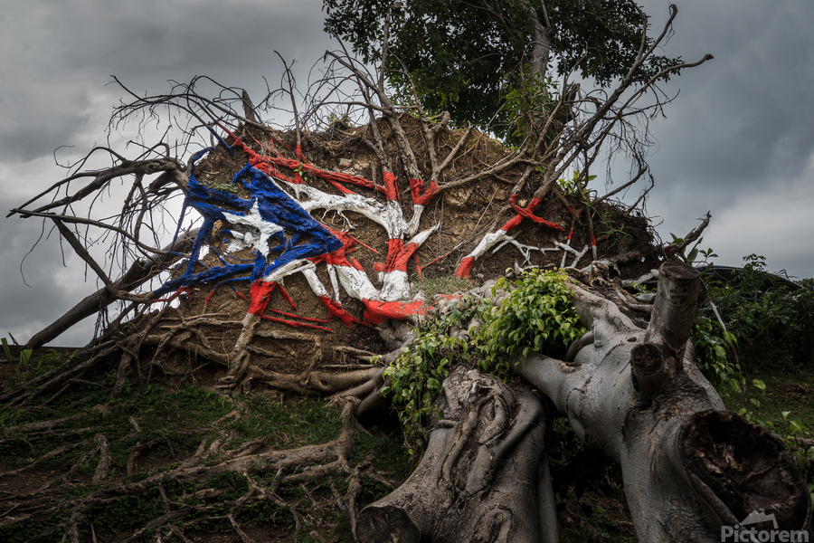 Painted Puerto Rico state flag on uprooted tree from Hurricane Maria in San Juan Puerto Rico.