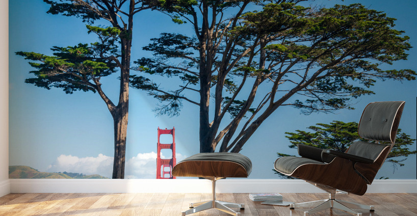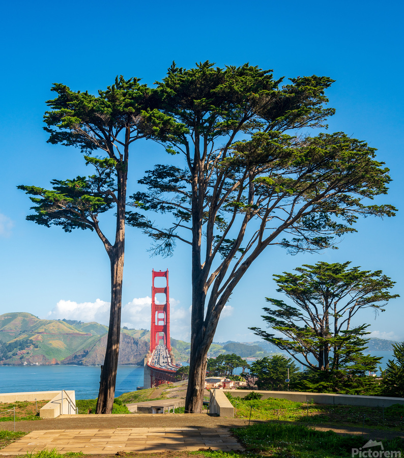 Marin Headlands with the Golden Gate Bridge taken with Cypress trees from Golden Gate park in San Francisco on clear spring day