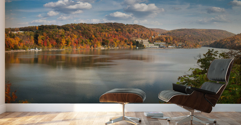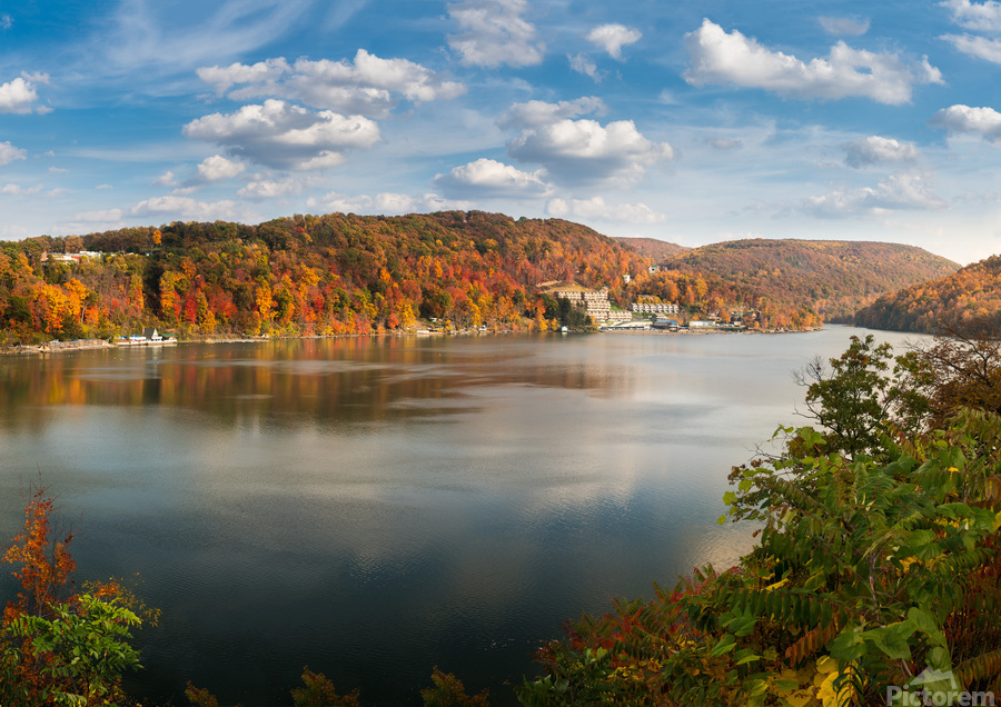 Panorama of the autumn fall colors surrounding Cheat Lake near Morgantown West Virginia