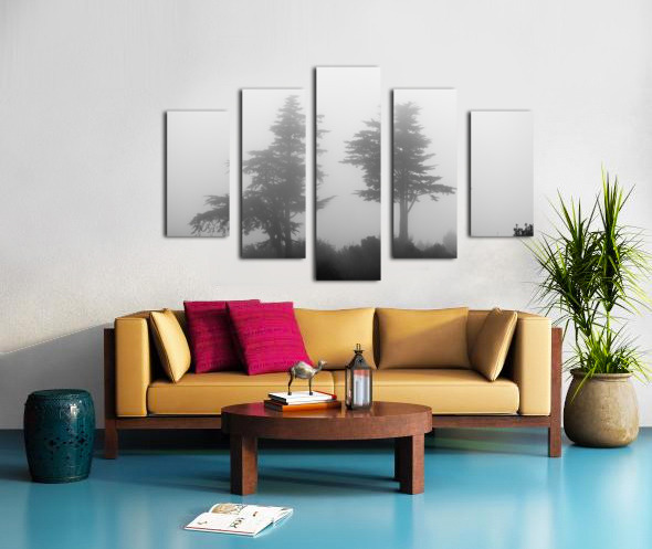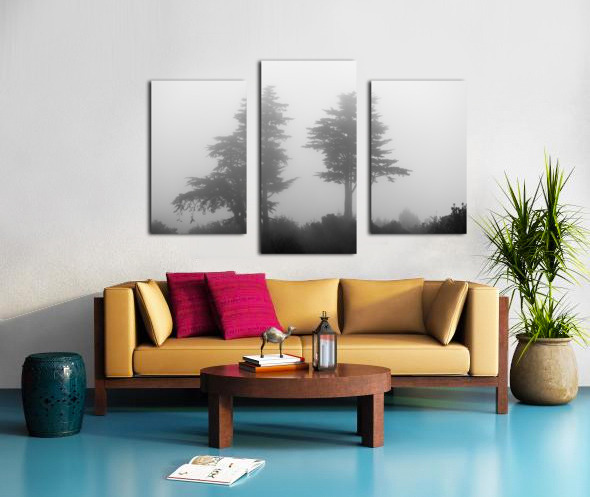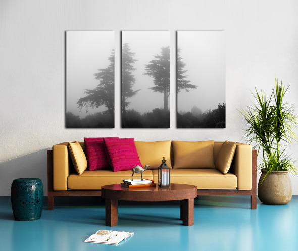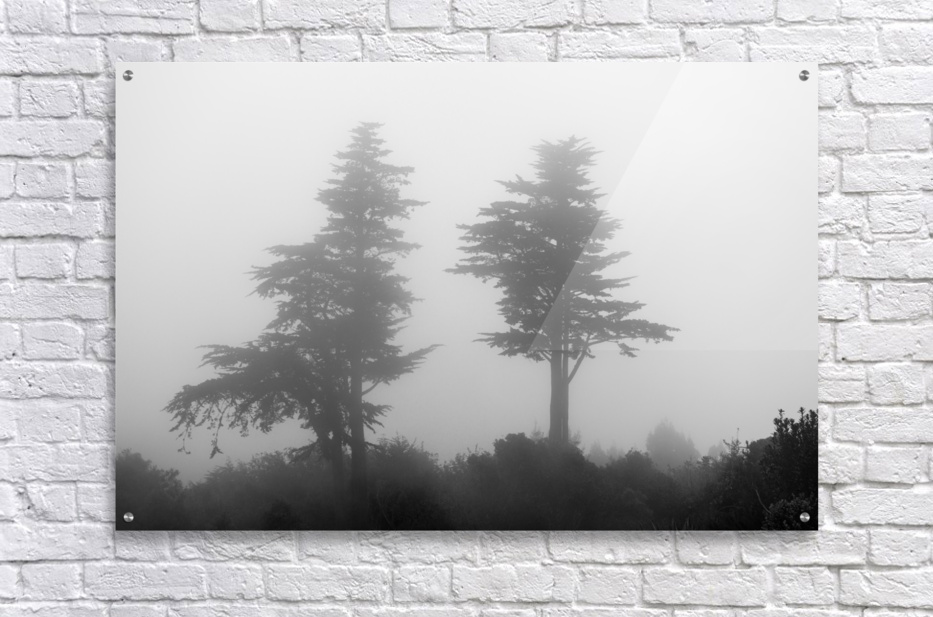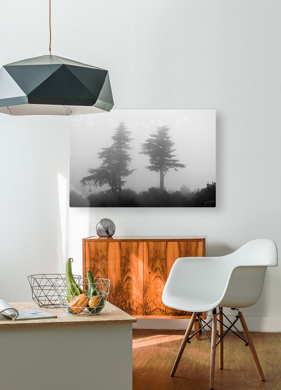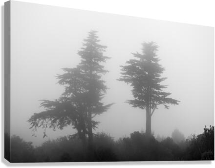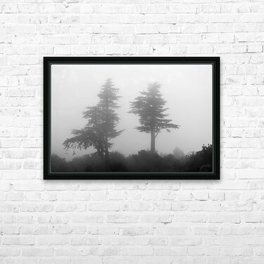 Pour obtenir "Mist and fog envelop two pine trees" dans une impression encadrée.