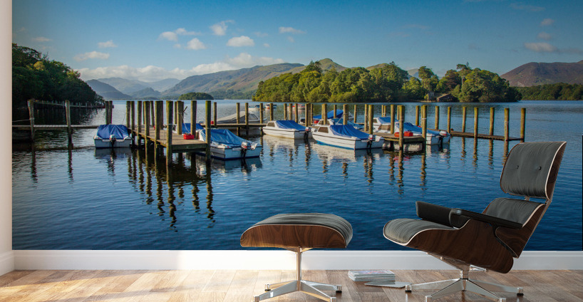 Piers and boats on edge of Derwentwater in English Lake District in early morning