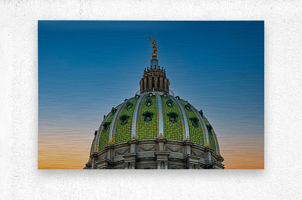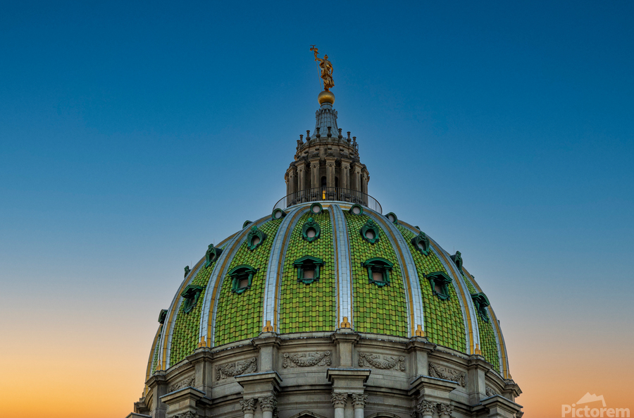 SUR CETTE OEUVRE: SUN SETS BEHIND THE ORNATE DOME OF PENNYSLVANIA STATE CAPITOL