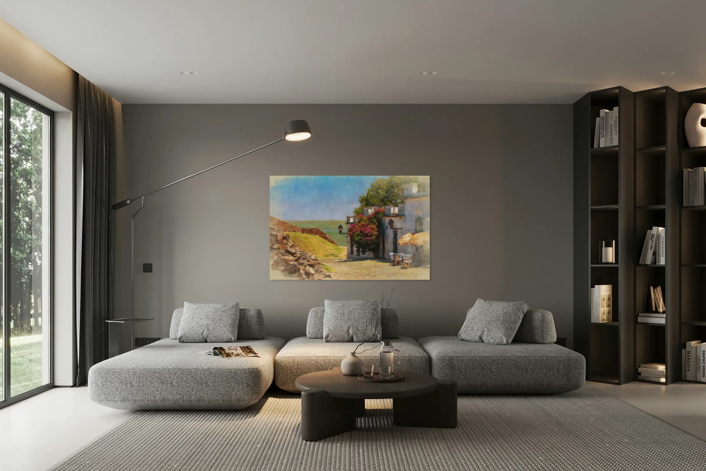 SUR CETTE OEUVRE: OIL PAINTING OF COBBLED STREET IN COLONIA DEL SACRAMENTO