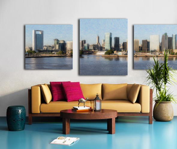 Color pencil drawing of the Buenos Aires skyline at the entrance to the port
