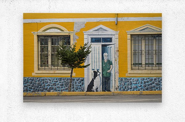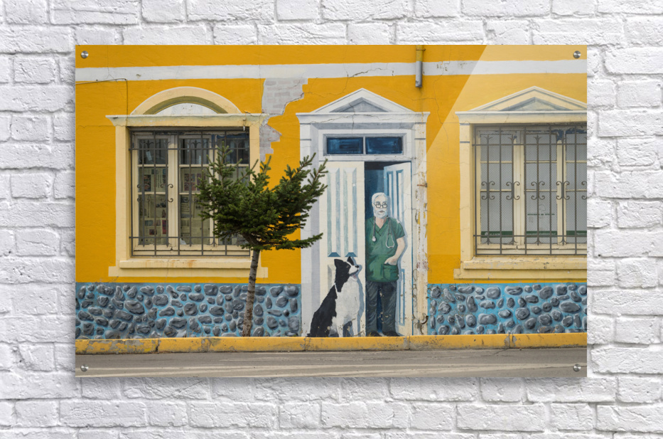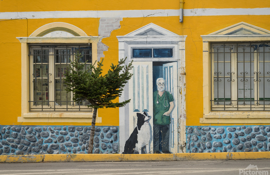 Punta Arenas Chile - 27 January 2023: Wall mural of vets office on bulding wall by seafront