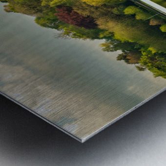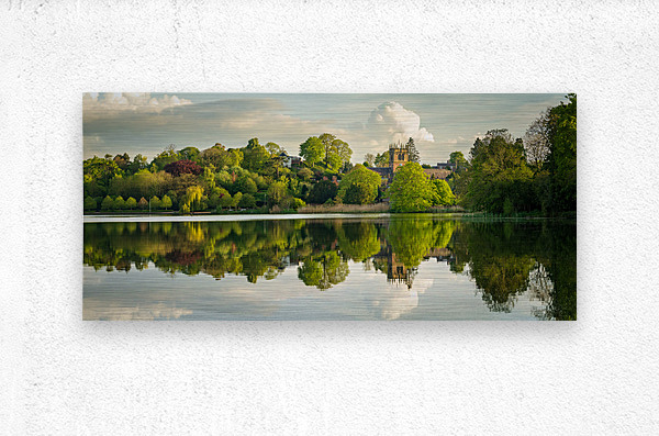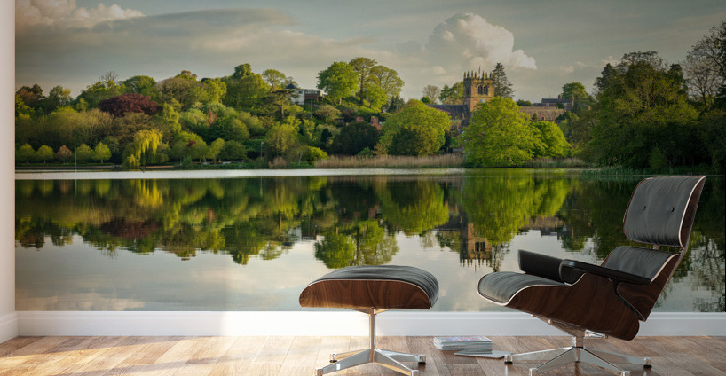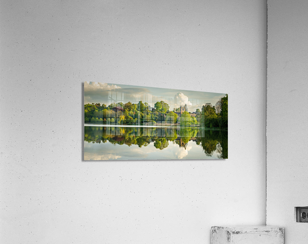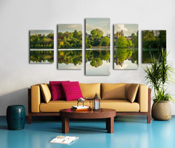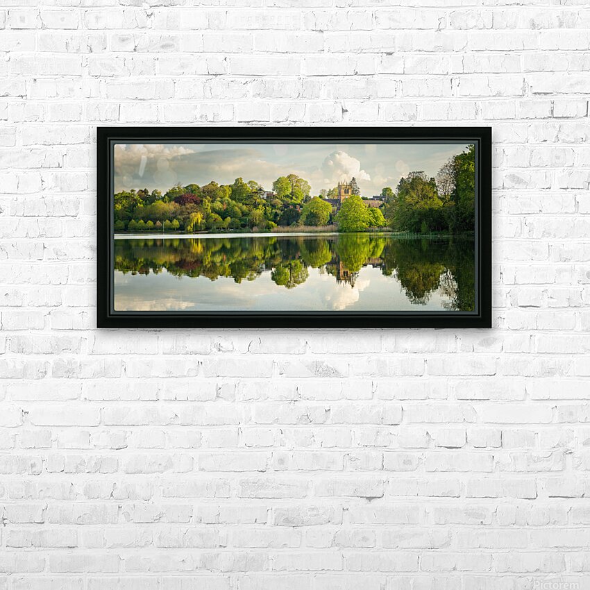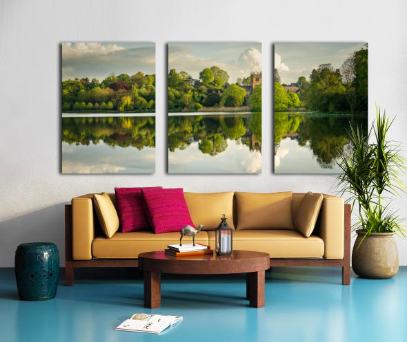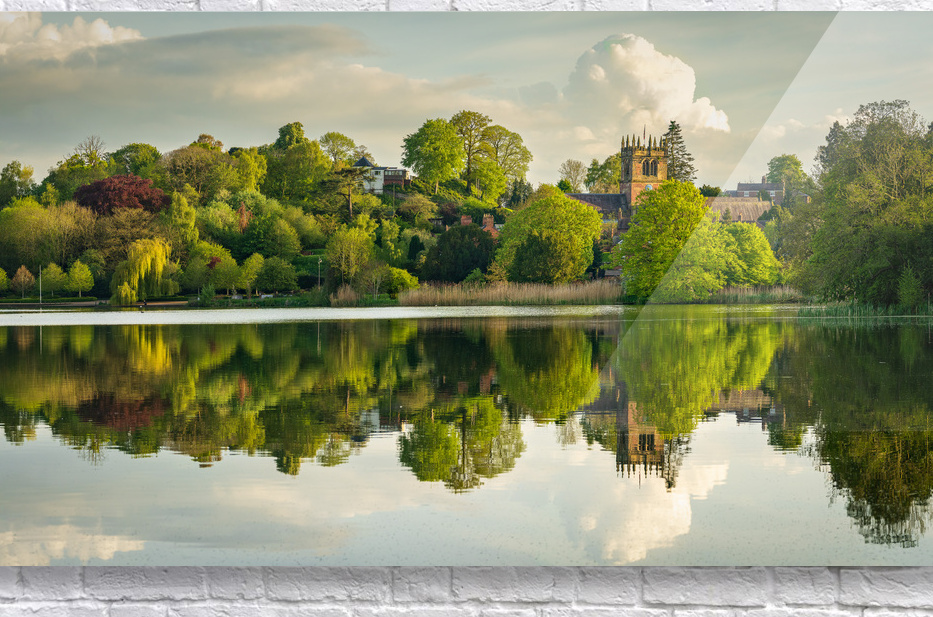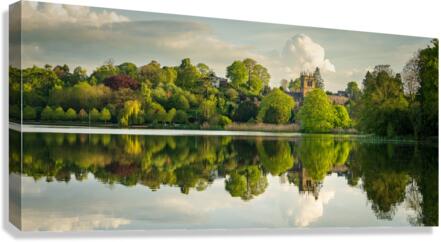 Panorama across the Mere to the town of Ellesmere in Shropshire Impression sur bois
