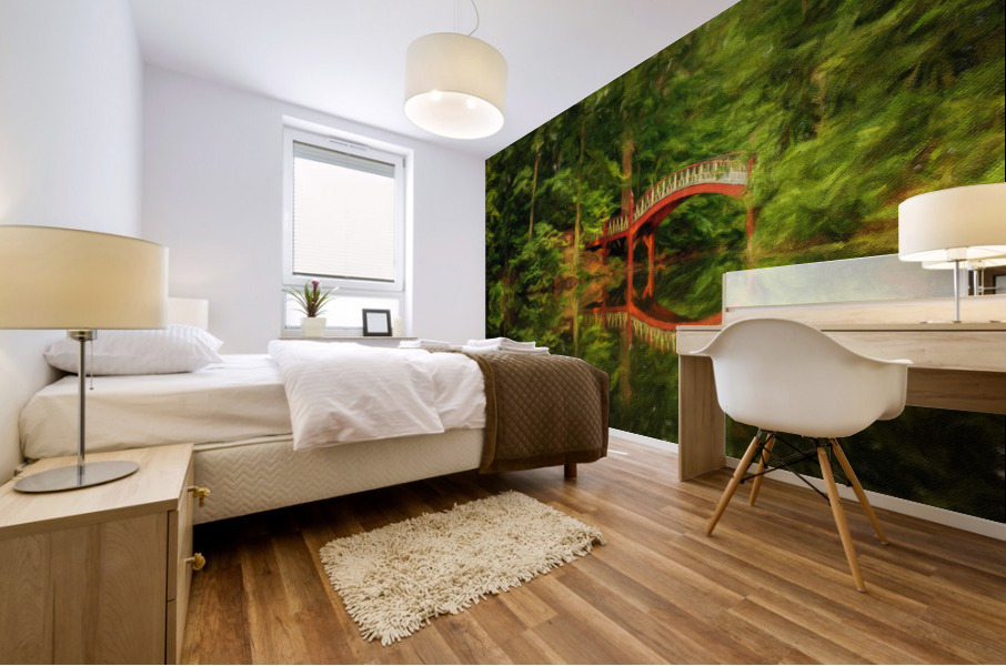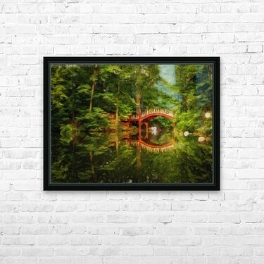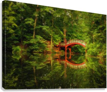 Impressionistic oil painting of the ornate wooden bridge over very calm Crim Dell pond on campus of William and Mary college in Williamsburg Virginia